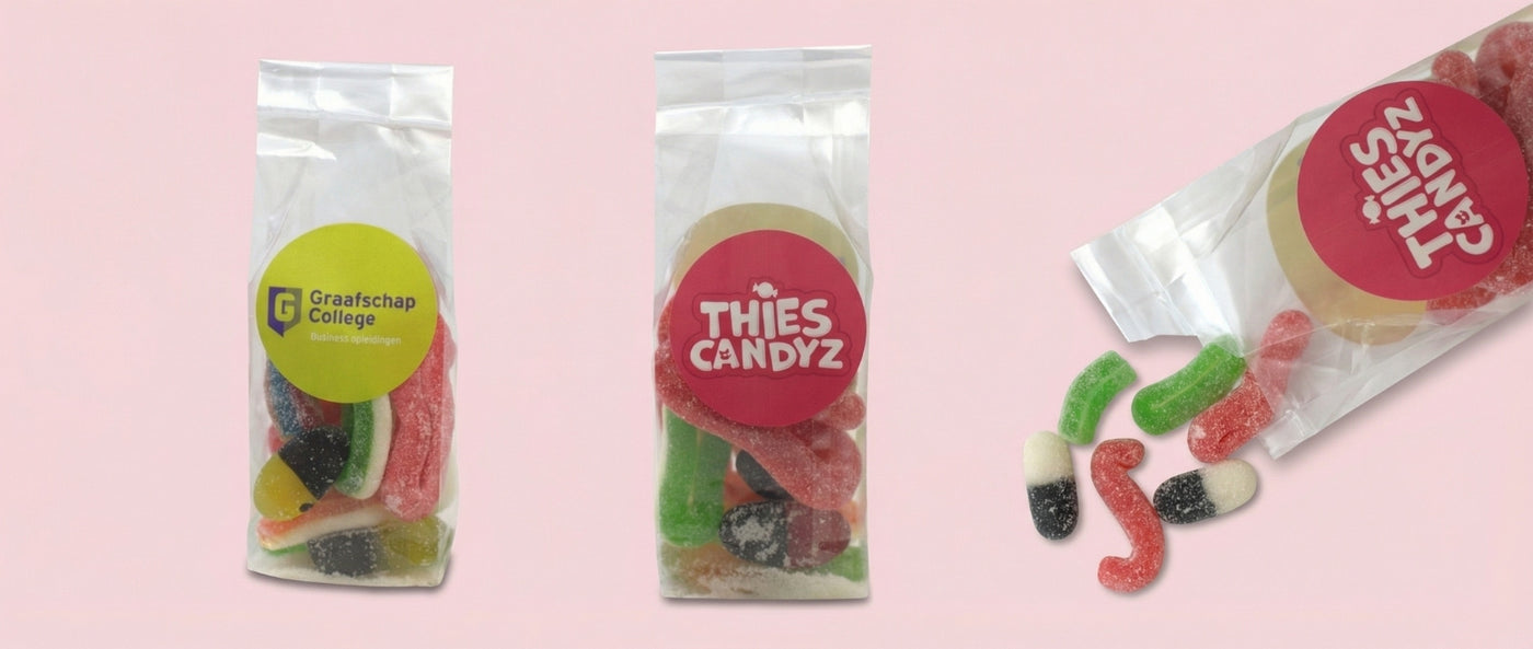 Voor zakelijke bestellingen kun je kiezen uit snoeppotten of snoepzakjes van 100 g. Beide worden professioneel gevuld en gelabeld met jouw bedrijfslogo op een sticker of label. Zo kun je het product perfect afstemmen op het gebruik: potten voor op kantoor of als relatiegeschenk, zakjes voor beurzen, events of goodiebags.