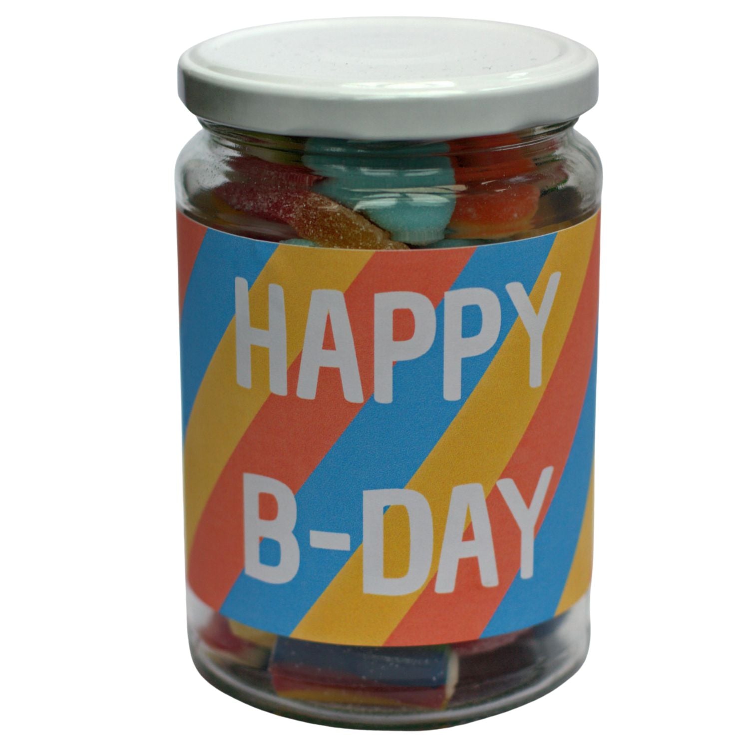 Het label met de tekst “Happy B-Day” in vrolijke kleuren maakt dit cadeautje extra feestelijk en geschikt voor zowel kinderen als volwassenen. Een smakelijke traktatie die gegarandeerd een glimlach oplevert.
