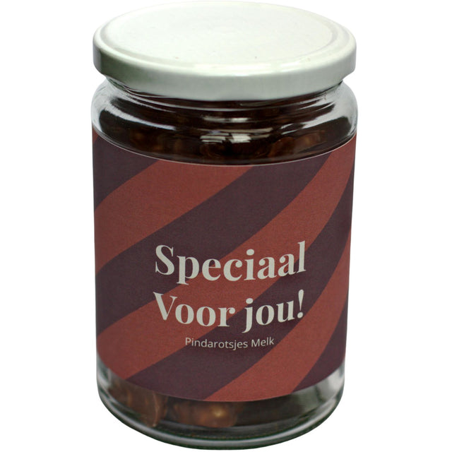 Deze glazen snoeppot is gevuld met 225 gram heerlijke pinda’s omhuld met romige melkchocolade. De perfecte combinatie van knapperig en zacht, verpakt in een stijlvolle pot met de tekst “Speciaal voor jou”. Een ideaal cadeautje om iemand te verrassen, bedanken of gewoon even te laten genieten.